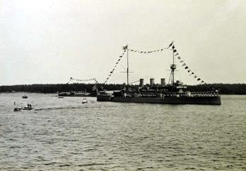 Общий вид на шведский крейсер, на палубе выстроена команда.