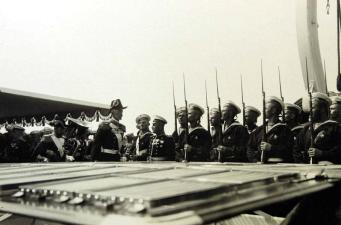 Король Швеции Густав V и император Николай II обходят почетный караул на яхте "Штандарт".