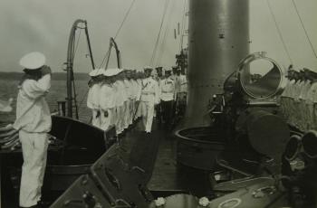 Император Николай II обходит команду эскадренного миноносца "Фини", выстроенную на палубе.