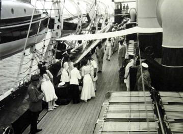 Императрица Александра Федоровна,с дочерьми и сопровождающими офицерами на палубе яхты, вручает подарки команде.