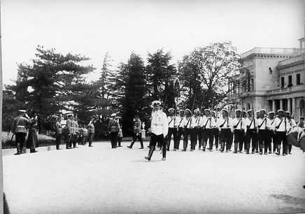 Император Николай II и цесаревич Алексей принимают парад Гвардейского флотского экипажа.