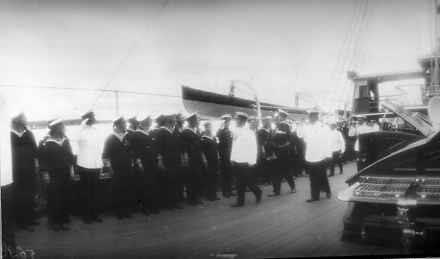 Император Николай II в сопровождении свиты с цесаревичем Алексеем, которого держит на руках боцман А.Е.Деревенько, обходит фронт матросов с миноносцев ""Царевна", "Украина" на палубе яхты "Штандарт".