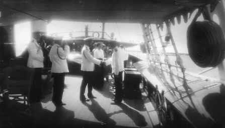 Император Николай II, вел.княгиня Ольга Александровна, дочери императора, великие княжны Мария, Анастасия обмениваются рукопожатием с офицерами яхты "Штандарт" на палубе яхты.