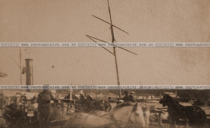 Члены императорской фамилии и военные чины свиты в экипажах у [Ново-Петергофской] пристани в день прибытия прусской делегации.