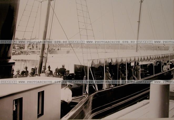 Император Николай II (в центре),члены императорской фамилии и высшие офицерские чины на яхте [в ожидании прибытия] германского императора Вильгельма II.