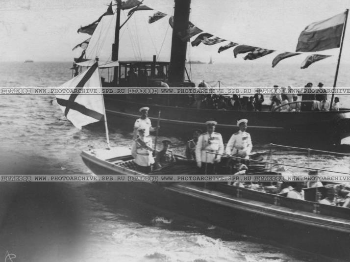Великий Князь Георгий Михайлович и сопровождающие его офицеры на военном катере "Петергоф" направляются к броненосцу Франция.